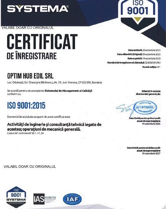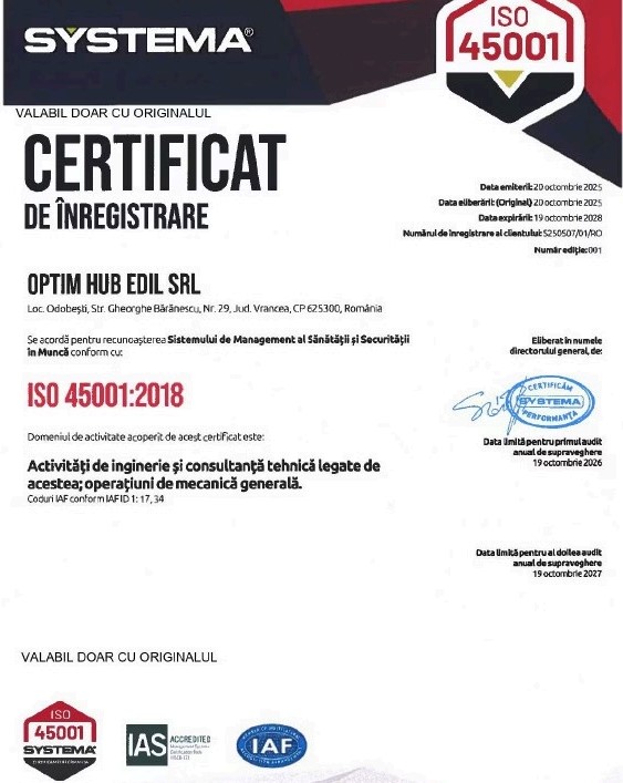Angajamentul nostru față de excelență este susținut de o serie de certificări ISO recunoscute la nivel internațional, care atestă conformitatea cu cele mai înalte standarde de calitate, mediu și sănătate ocupațională.